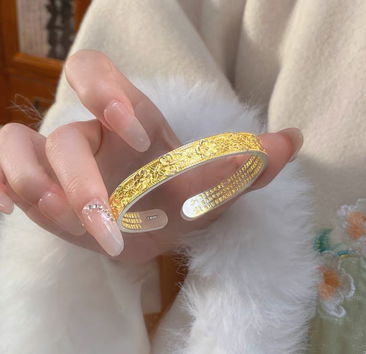 999 Pure Silver Gold-Plated Peach Blossom and Butterfly Bracelet for Women, Pure Silver Chinese Style Heart Sutra Bracelet, Open-Ended, Birthday Gift for Girlfriend