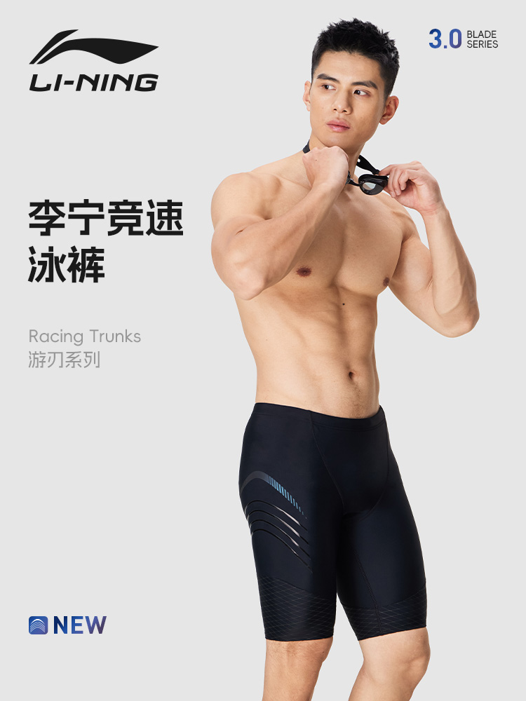 Li-Ning Men's Professional Racing Swim Trunks, Knee-Length, for Swimming Training, Anti-Embarrassment, Suitable for Hot Springs, Men's Swimming Gear