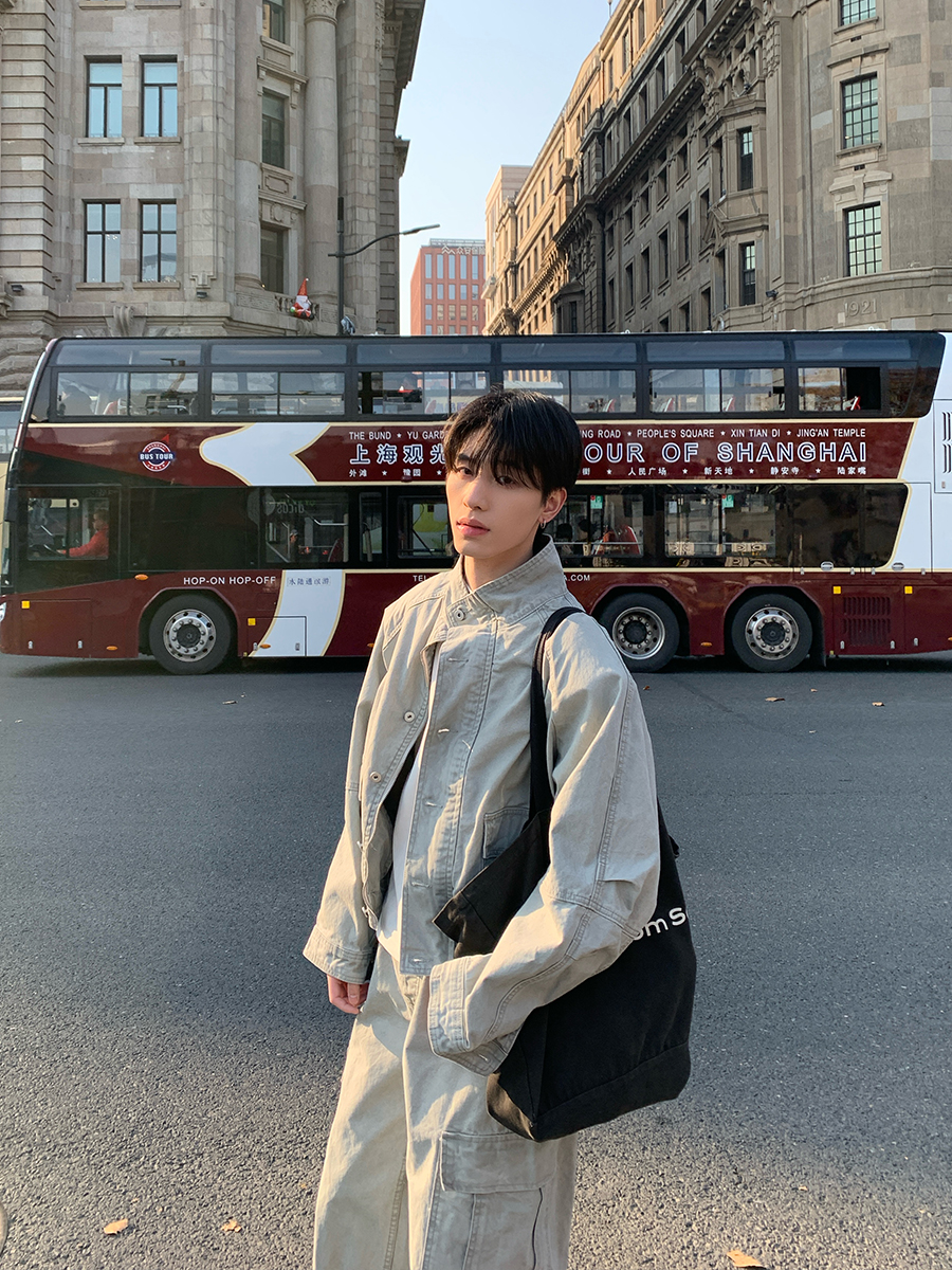 Onelyc1Ns Stand-Up Collar Large Pocket Workwear Casual Suit for Men, Spring Stylish Loose Jacket with Wide-Leg Scimitar Pants