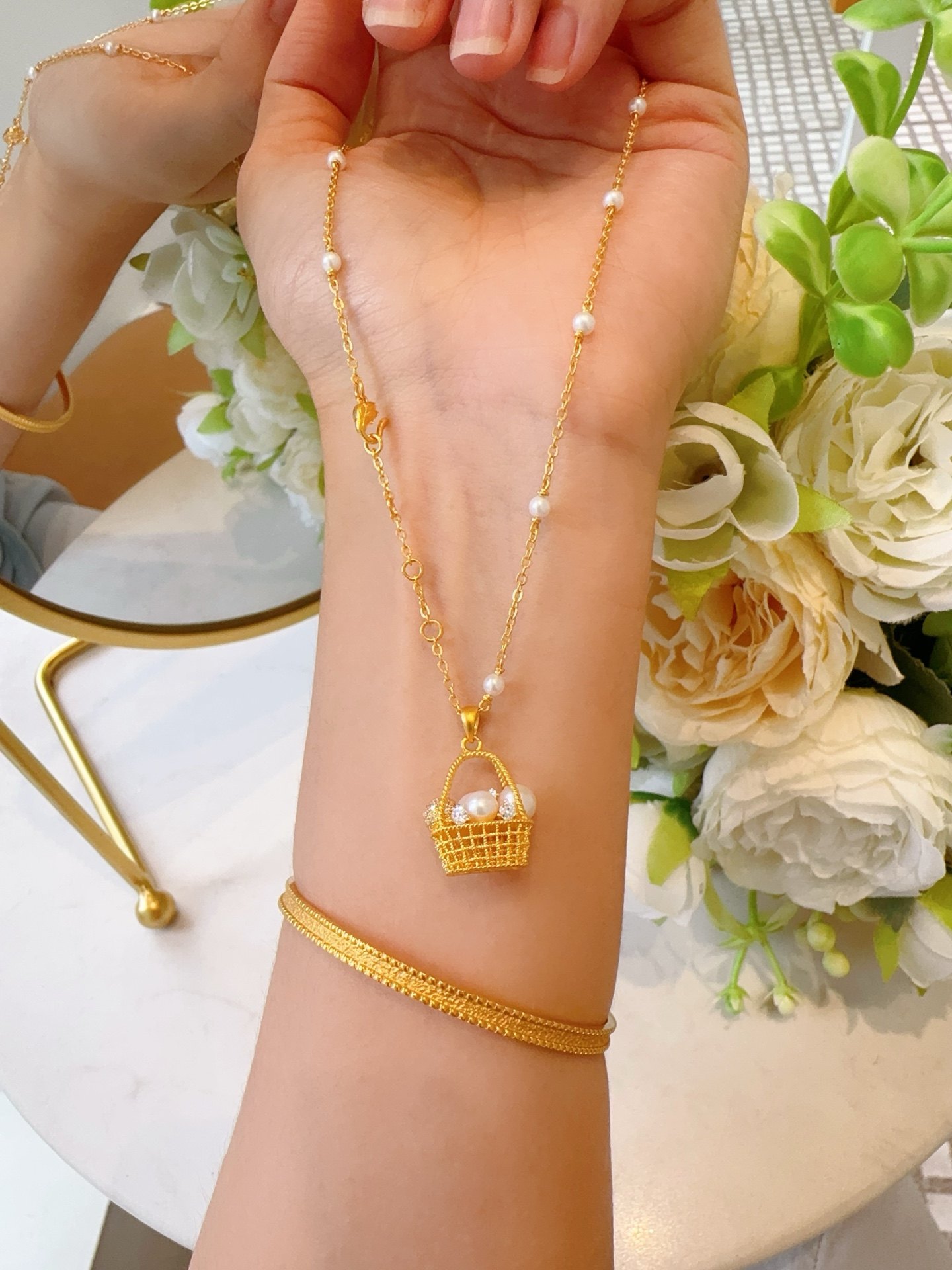 Golden Palace Ancient Style Pure Gold Inlaid Pearl Pendant Fashionable Light Luxury Small Flower Basket White Romantic Pendant