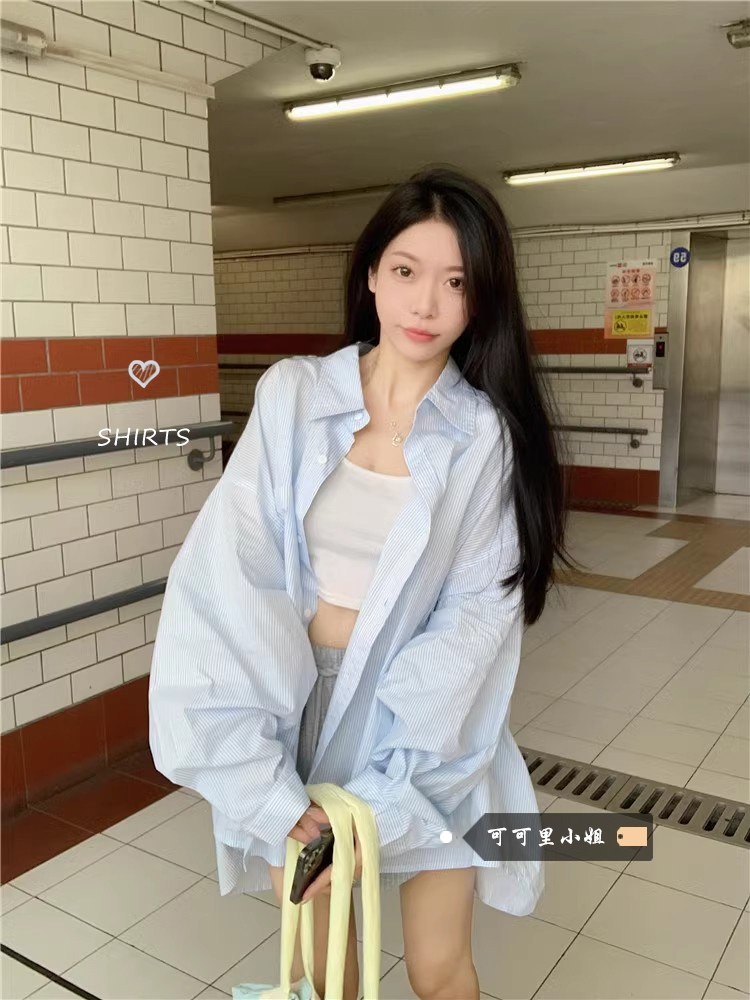 Miss Coco Blue Striped Shirt for Women, Spring Design, Loose Long-Sleeved Sun-Protective Mid-Length Jacket Top