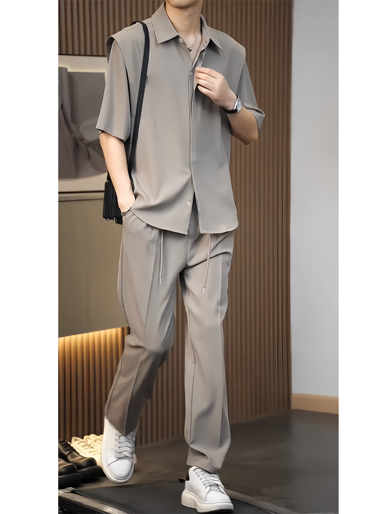 Korean-Style High-End Drapey Shirt Set for Men, Summer Cool and Stylish Outfit, Trendy Ice Silk Short-Sleeve Shirt Two-Piece Set