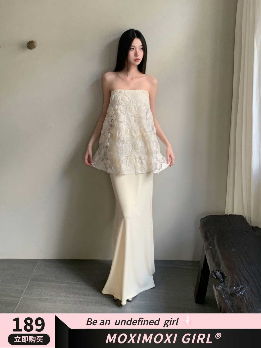 Moxi Spring Ode Three-Dimensional Rose Embroidery Floral Sequin A-Line Strapless Mermaid Skirt Tulle Set
