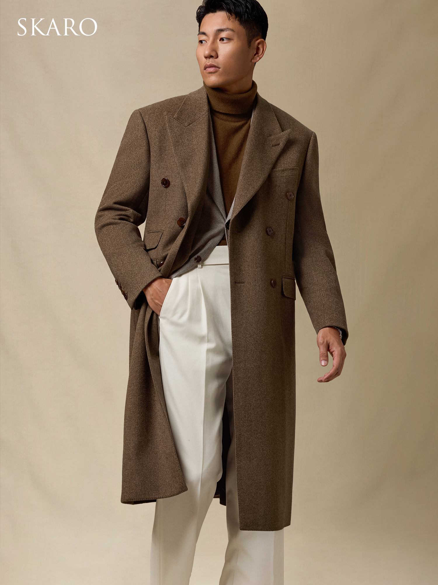 [Contains Cashmere] Skaro Suit Collar Wool Coat for Men, Autumn and Winter Herringbone Pattern Double-Breasted Long Woolen Coat