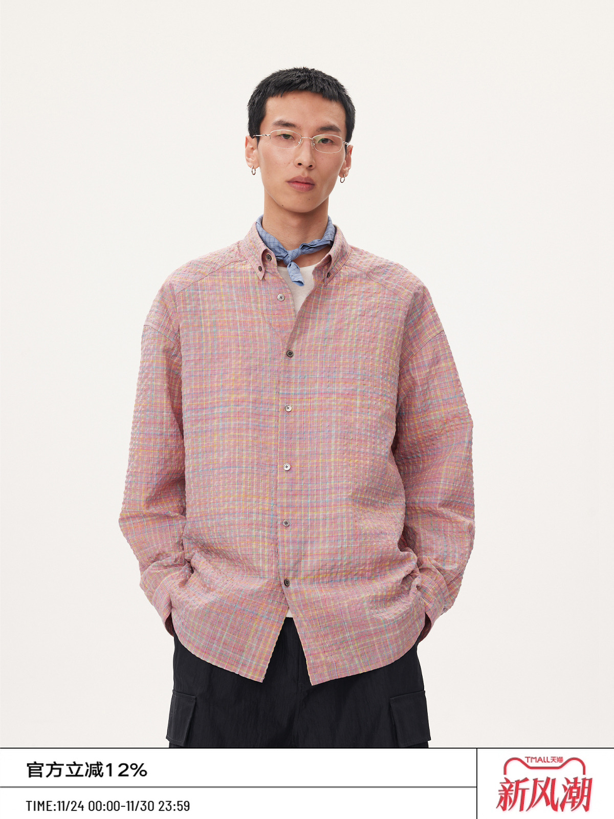 Common Scents Classic Style Yarn-Dyed Plaid Seersucker Cross-Over Loose Fit Long-Sleeve Shirt
