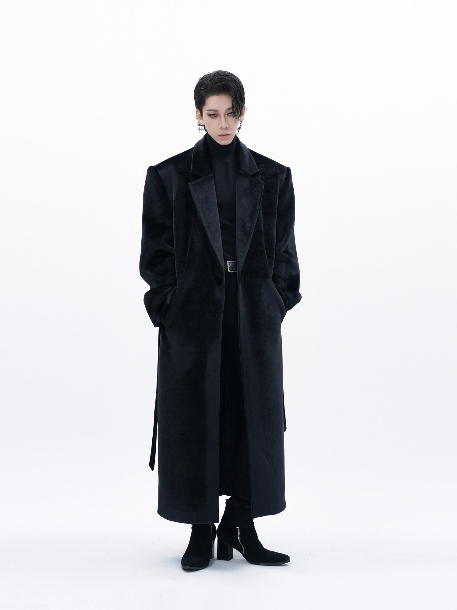 Harh "Rain in New York" Liu Yuning's Same Style Black Velvet Woolen Coat, Winter Belted Long Woolen Coat