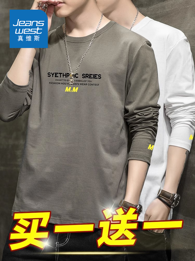 Jeanswest Long-Sleeve T-Shirt for Men 2025 Spring and Autumn Trendy Brand Loose Printed Casual Base Shirt Breathable Pure Cotton Top