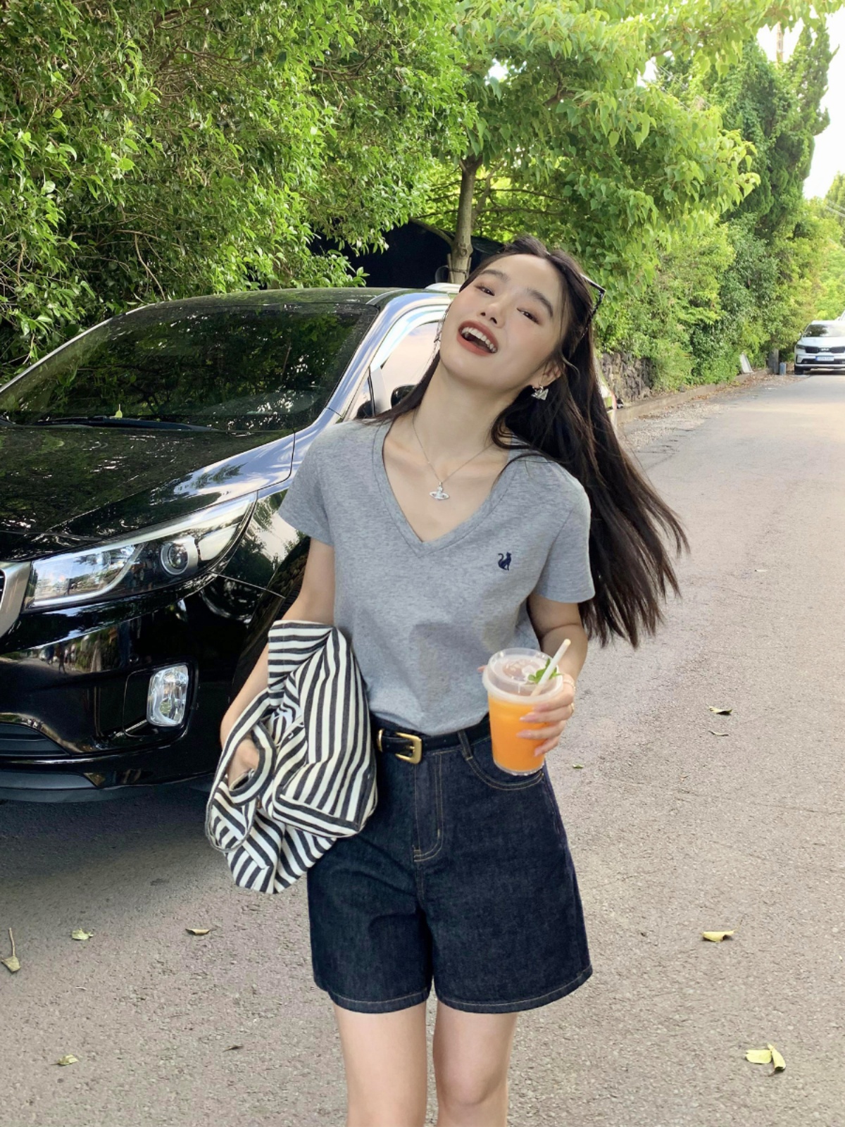 Pusumede V Neck Pure Cotton White Short-Sleeved T-Shirt for Women Summer New Niche Embroidered Loose Casual Right Shoulder Top