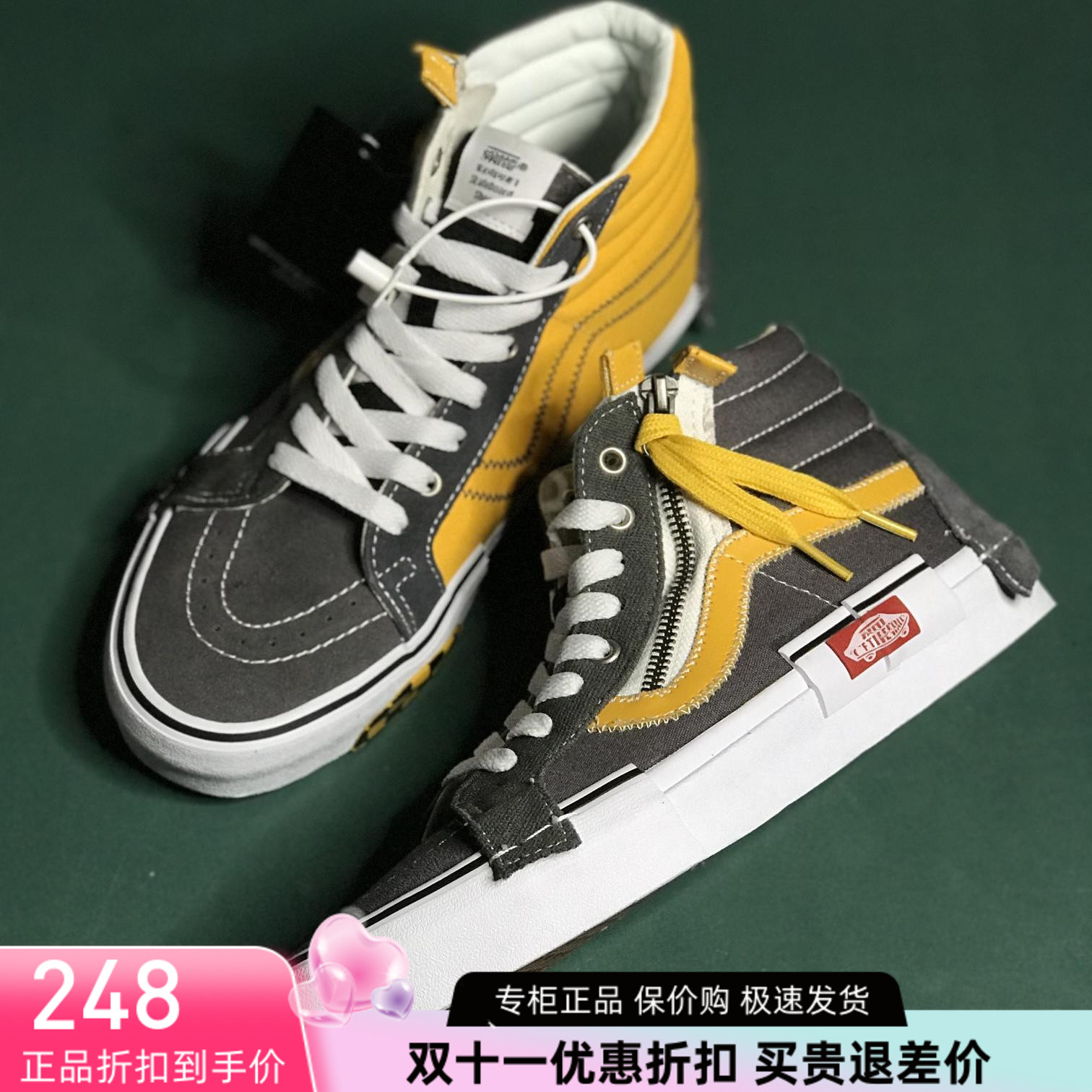Sk8-Hi Cap Black and White High-Top Deconstructed Zipper Patchwork Gray-Yellow Patchwork Checkerboard Canvas Unisex Sneakers