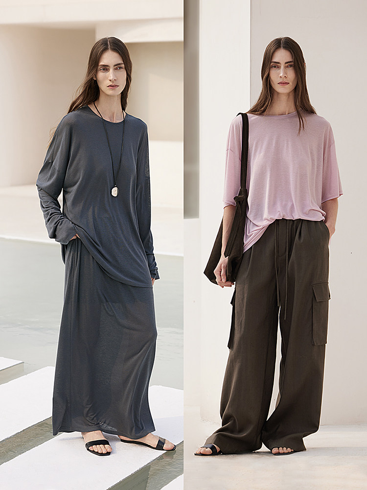 Chicjoc Lightweight and Natural-Feeling Tencel Wool Knit Relaxed Paper-Thin Round Neck Short/Long Sleeve Air T-Shirt/Skirt
