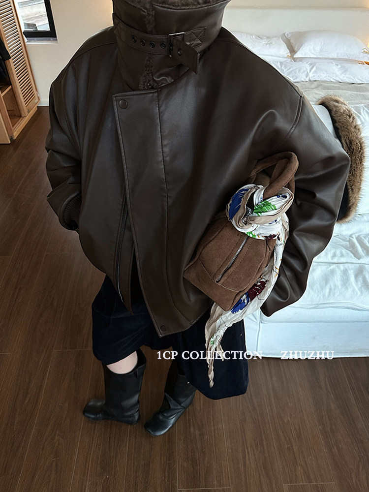 1Cp Brown Stand-Up Collar Fur-Lined Jacket for Women, Thick 2025 Winter New Style, Black, Frost-Resistant, Windproof, Warm Top