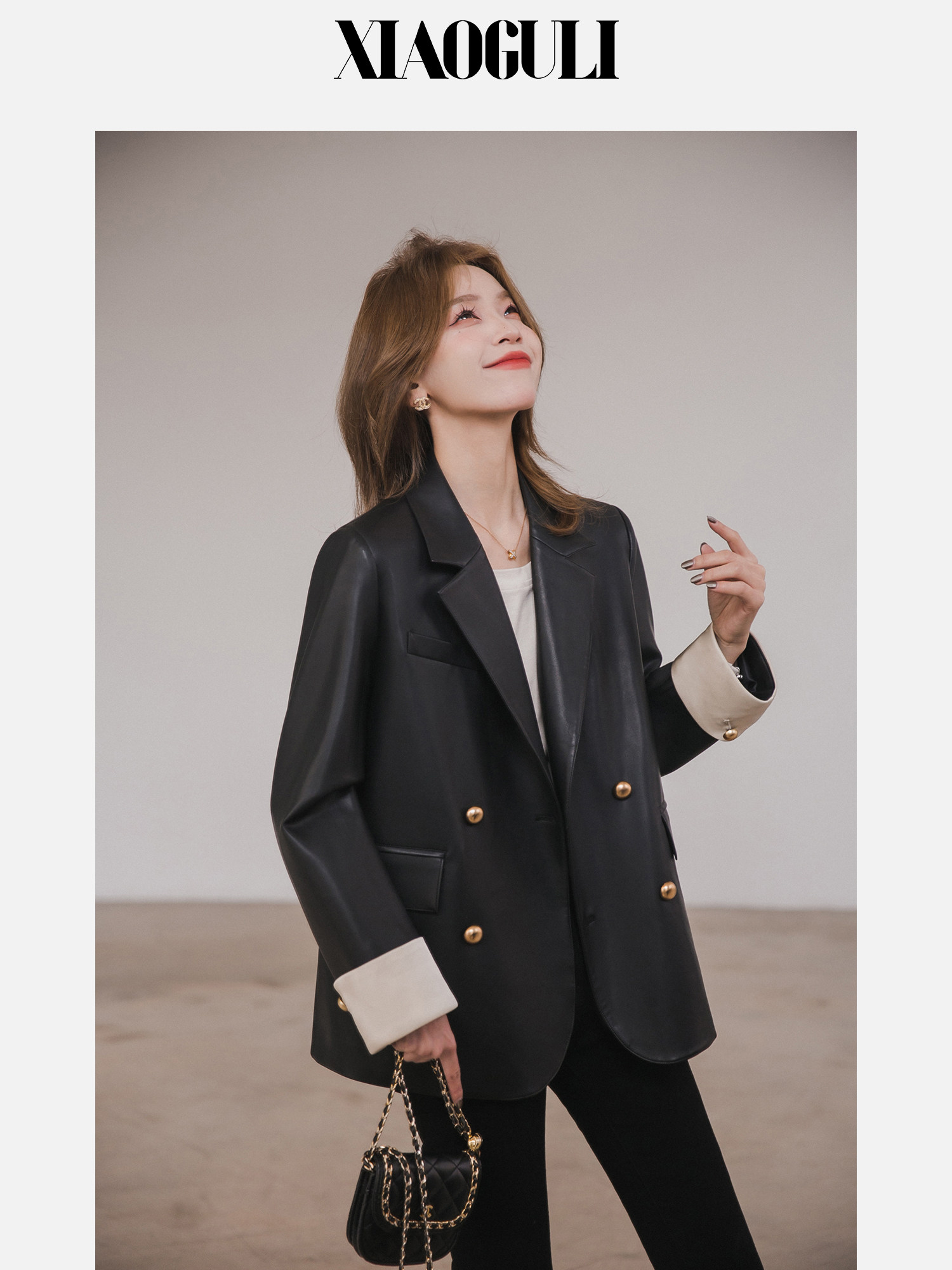 Xiaoguli Rose Leather Jacket, High-End Black Pu Leather Jacket for Women, Autumn Korean Style Design, Color-Blocked Suit