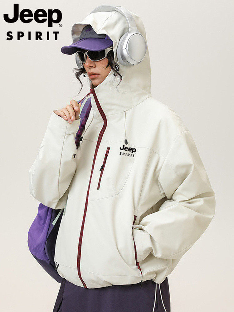 Jeep Three-In-One Short Jacket for Women, Spring and Autum Loose Outdoor Waterproof Hiking and Mountaineering Hooded Jacket