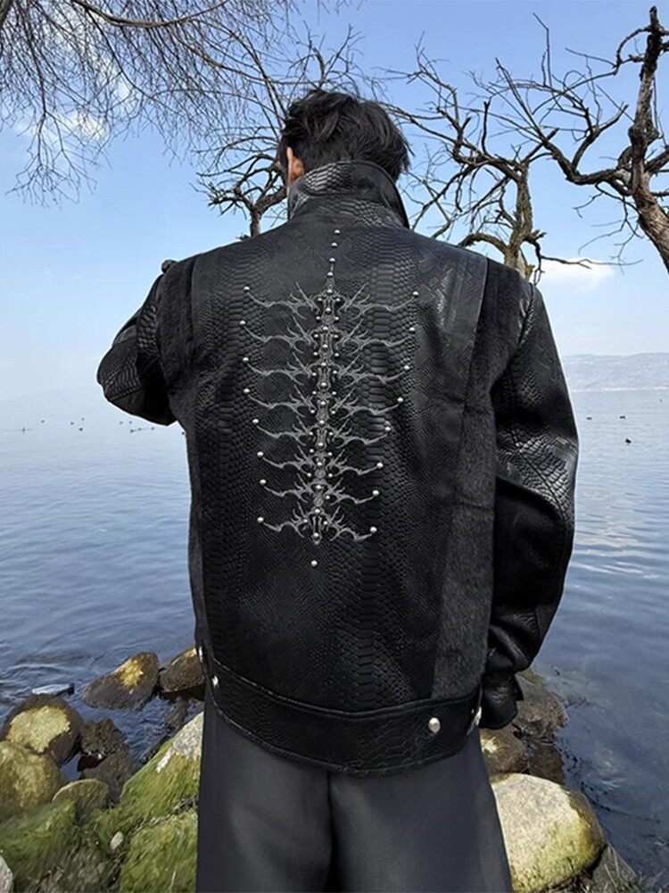 American-Style Trendy Brand Snake Eye Spine Niche Pattern Snakeskin Patchwork Jacket for Men with Rivets and Embroidery Pu Leather Coat for Men