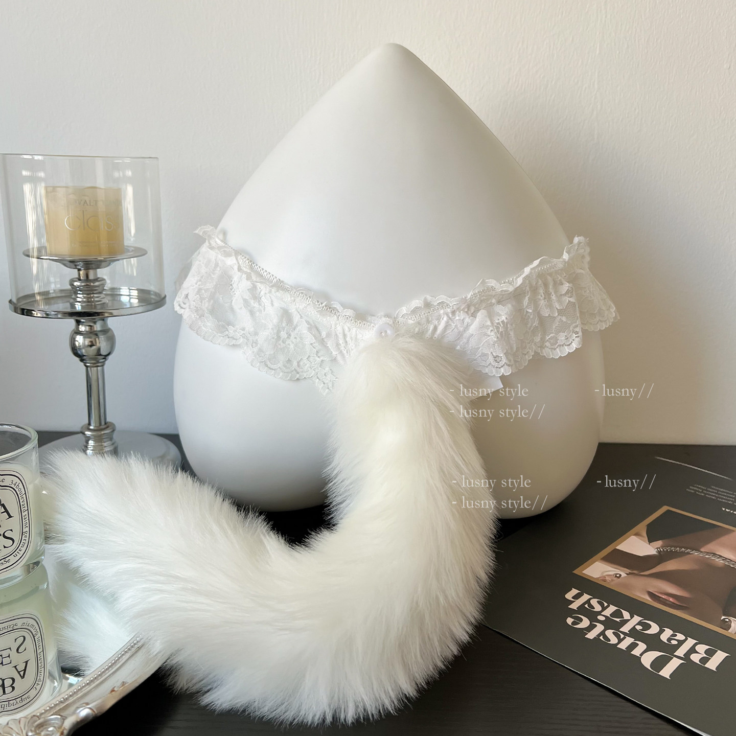 Uncle Deer: Sexy and Cute Cat Tail Thong Low-Waist Lace Cosplay Fox Fur Ball Tail Pearl Briefs