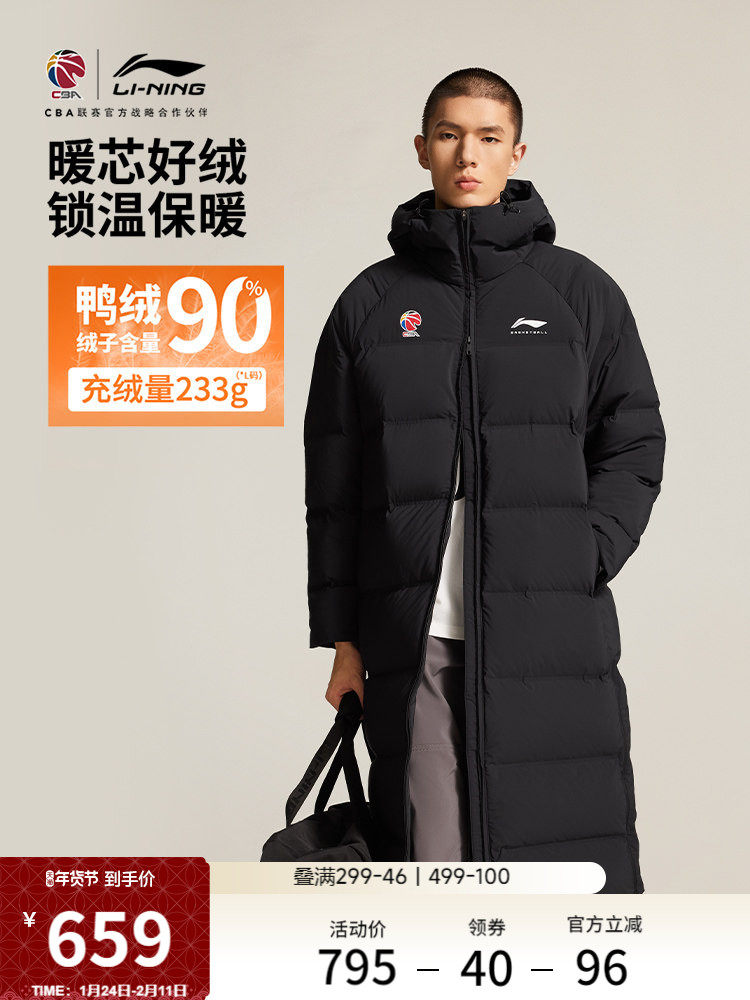 Li Ning Men's Official New Winter Thickened down Jacket, Cold-Proof Hooded Long Warm Coat, Sportswear