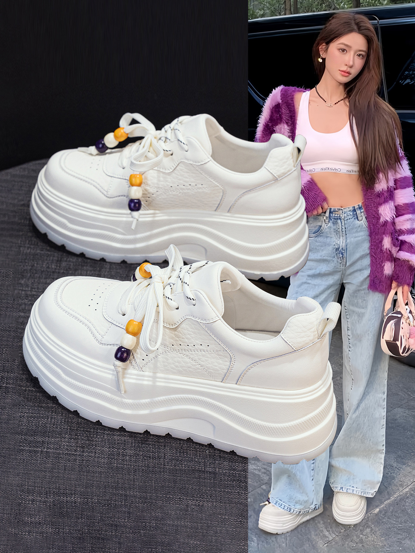 Hong Kong Genuine Leather Height-Increasing Lace-Up Thick-Soled White Sneakers for Women 2025 Spring and Autumn New Versatile Fashion Retro Casual Sneakers