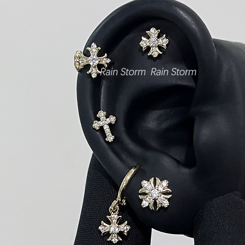 Rain Storm Iris Cross Light Brown Gold Earring Set Niche Titanium Steel Sparkling Diamond Layered Ear Bone Stud Earrings