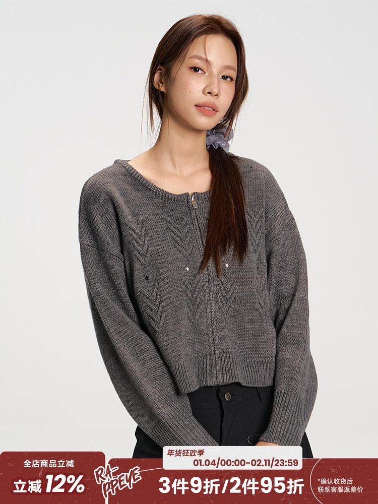 Rappeye Retro Simple Jacquard Cut Out Loose Round Neck Zipper Sweater Wool Knitted Arrow Cardigan Jacket