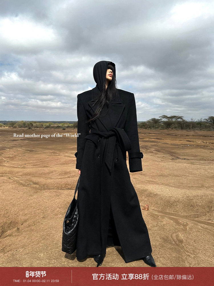 0122Stepll Classic Upgraded Black Wool Coat for Tall Women, Winter Waist-Cinching Elegant Long Woolen Coat