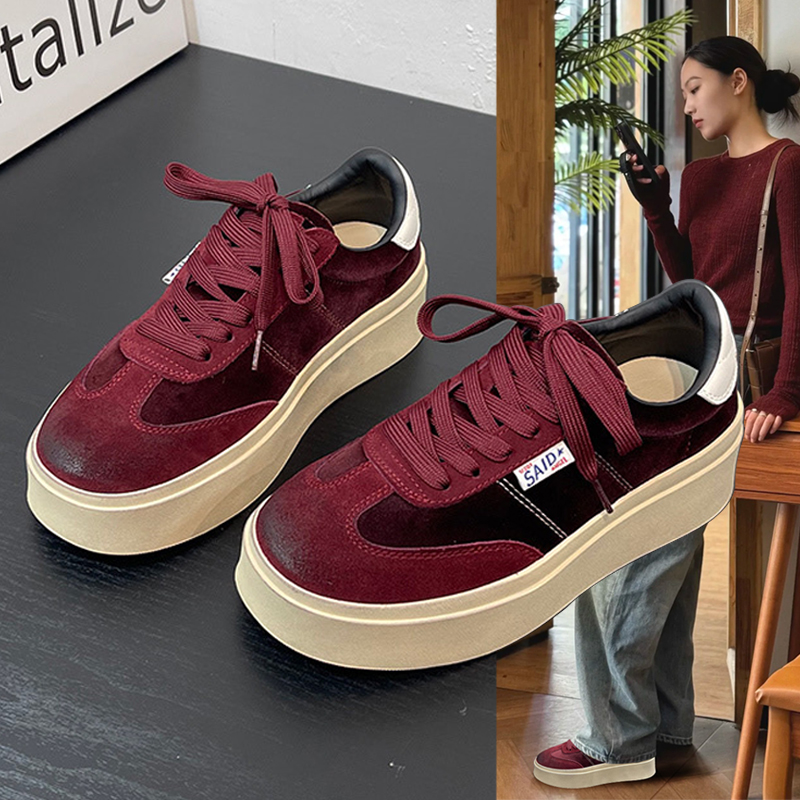 Sanli Genuine Leather Thick Sole Height Increasing Casual Shoes for Women 2025 New arrival Ankesela Red Suede Round Toe Shoelace Sports Sneakers