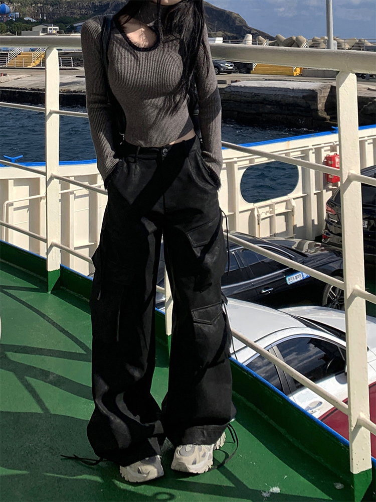 Funnj Square Table Long Legs Cool Cover Black Loose Wide Legs Straight-leg Leather Pants Women's Heavy Industry Pu Leather parka Casual Pants