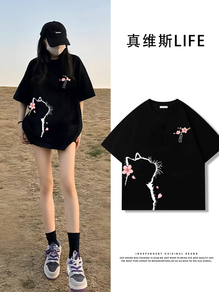 Jeanswest Black Short-Sleeved Women's T-Shirt Summer 2024 New arrival Summer Plus size Plus Size Ladies Unique and Super Good-Looking Long sleeves Tops X