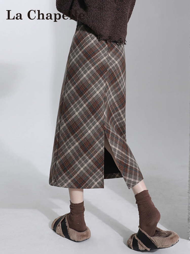 La Chapelle Plaid Woolen Skirt for Women Spring & Fall Winter 2024 New arrival high waist Slim Looking A-Line Slit Mid-Length Skirt