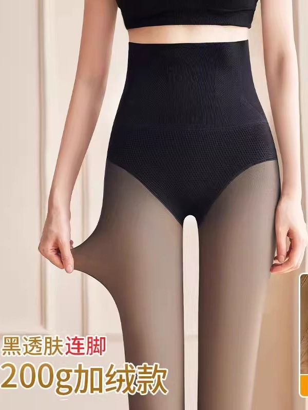 [Fleece-lined thickened] Translucent Pants Autumn and Winter high waist Tummy Control Outwear Leggings Skin Tights Black Translucent Skin Feet