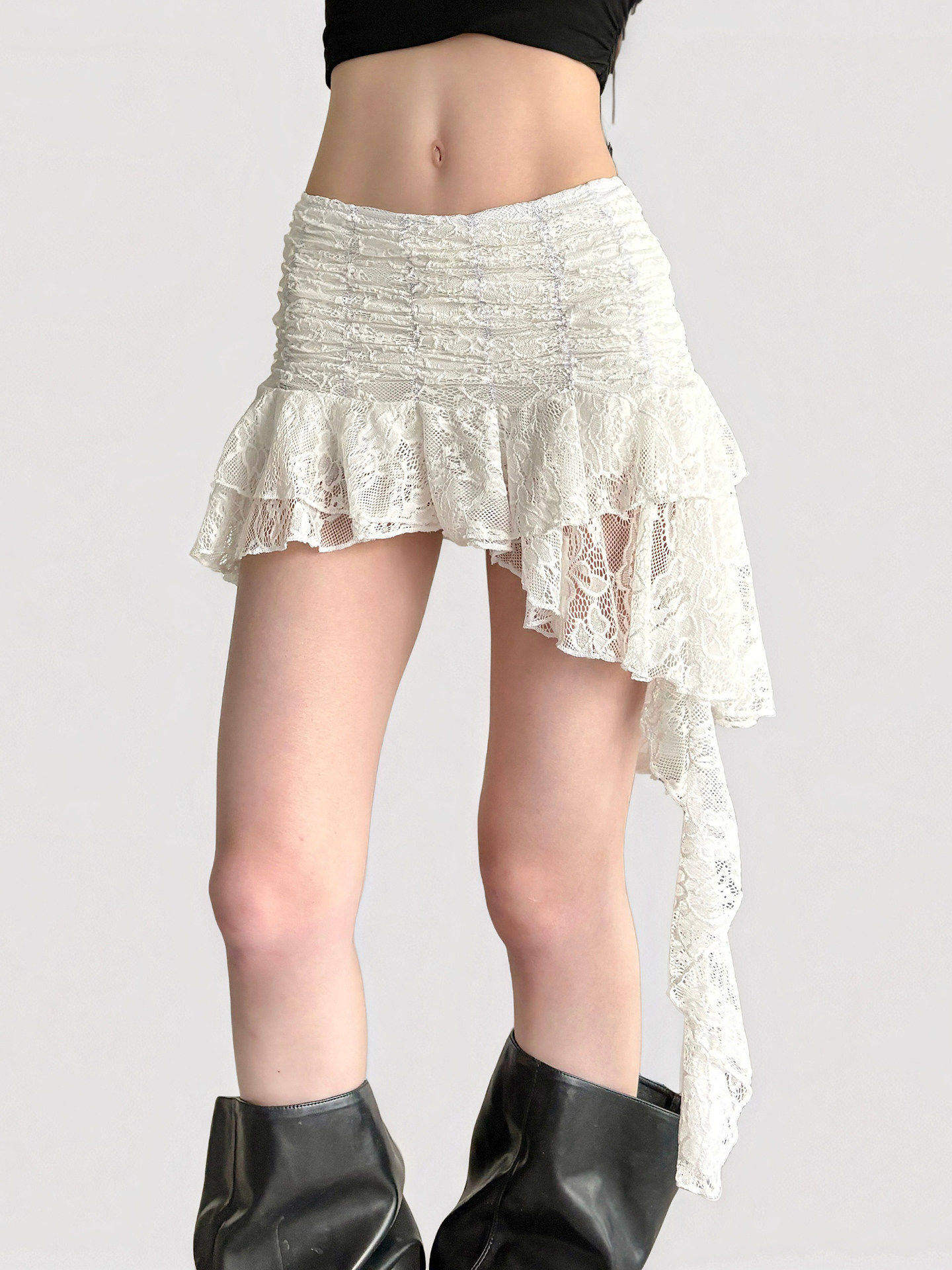 Funoff French Retro White Lace Asymmetrical Ribbon Skirt Bohemian Style Sexy Tiered Short Skirt Summer