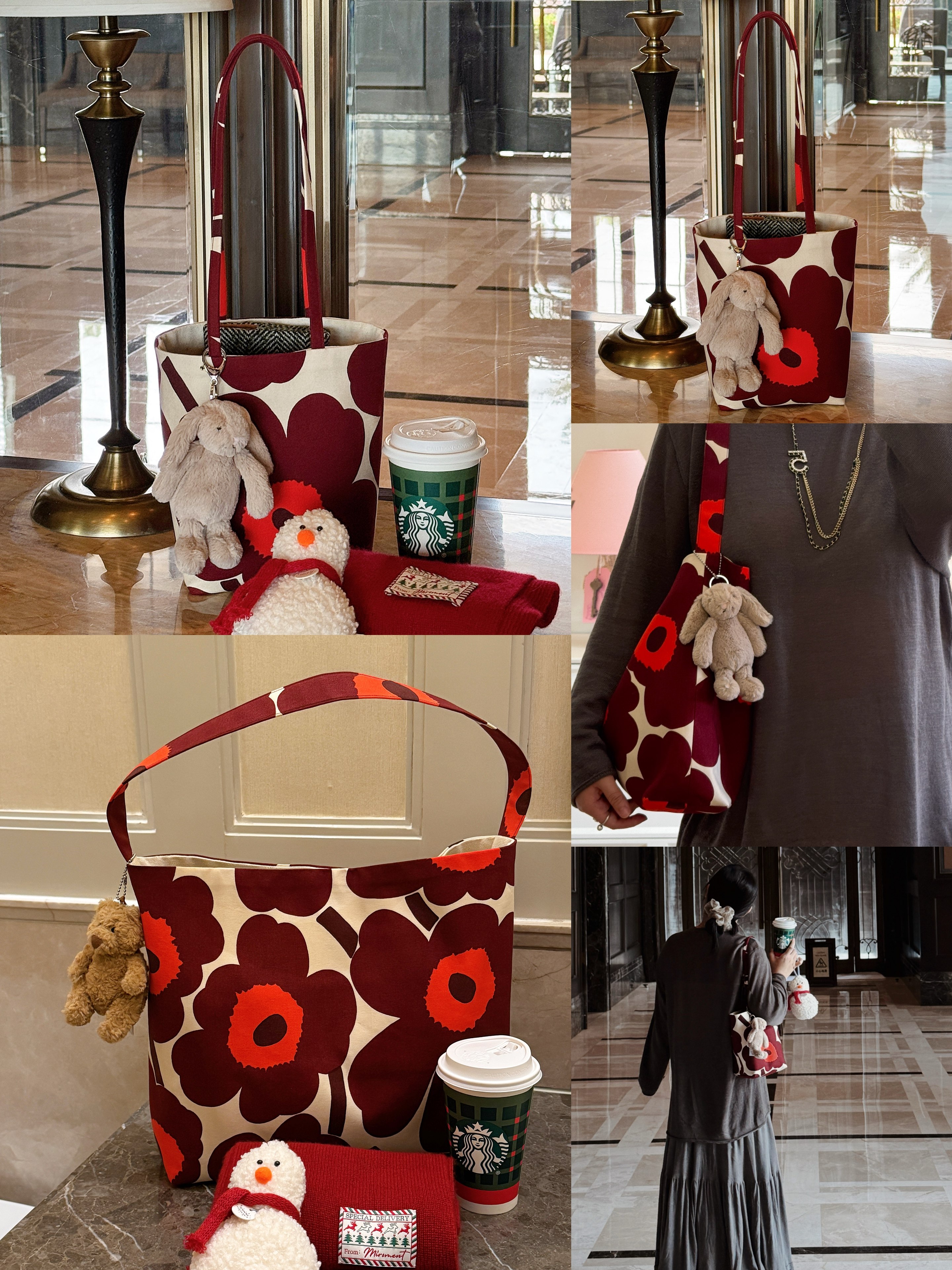 Coral Flowers | Limited Edition Marimekko Christmas and New Year Burgundy Red | Original “Hobo” Bucket Bag