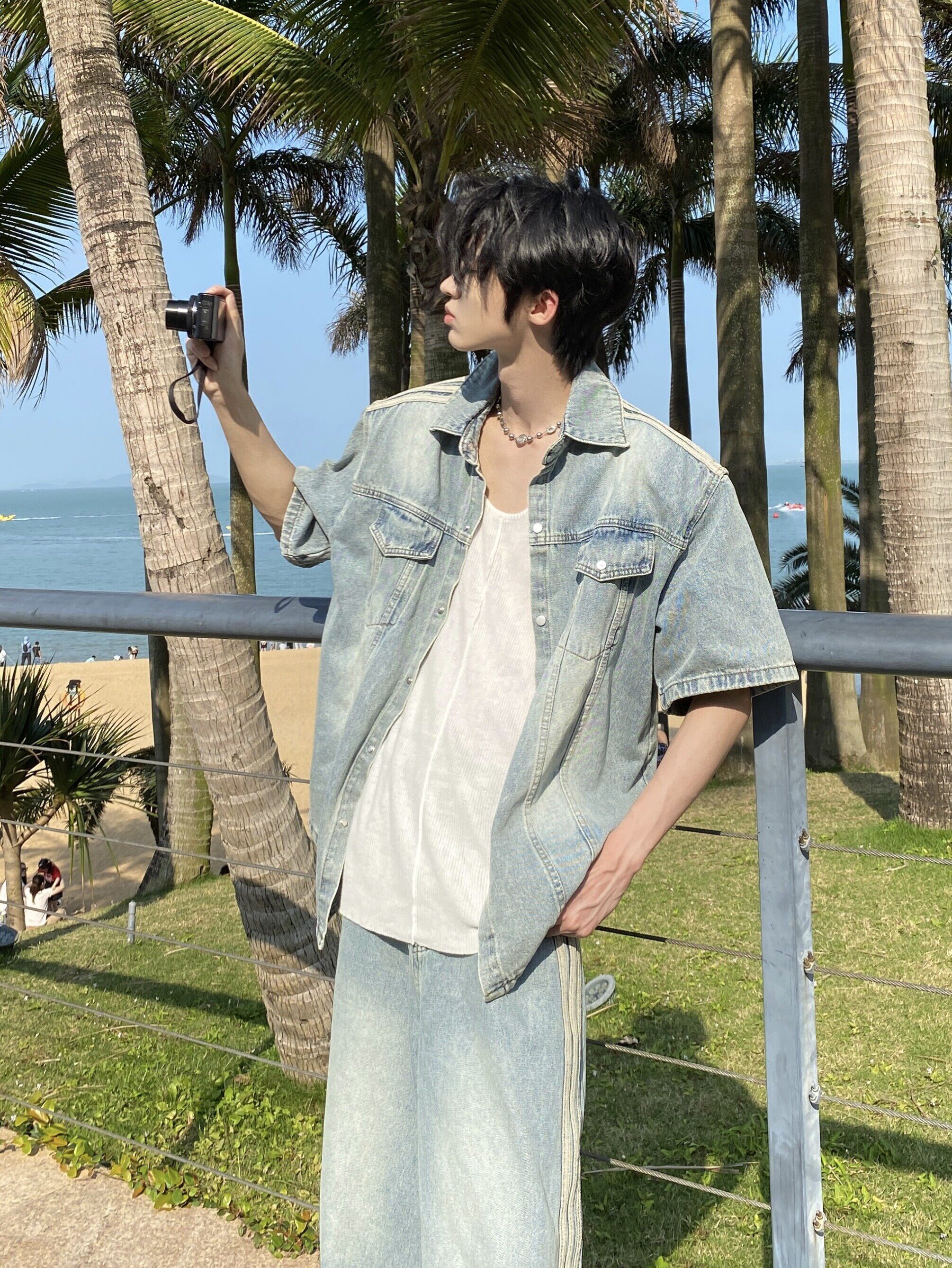 Desaturate Niche Retro Shoulder-Padded Denim Short-Sleeve Shirt Set with Striped Design and Washed Denim Pants