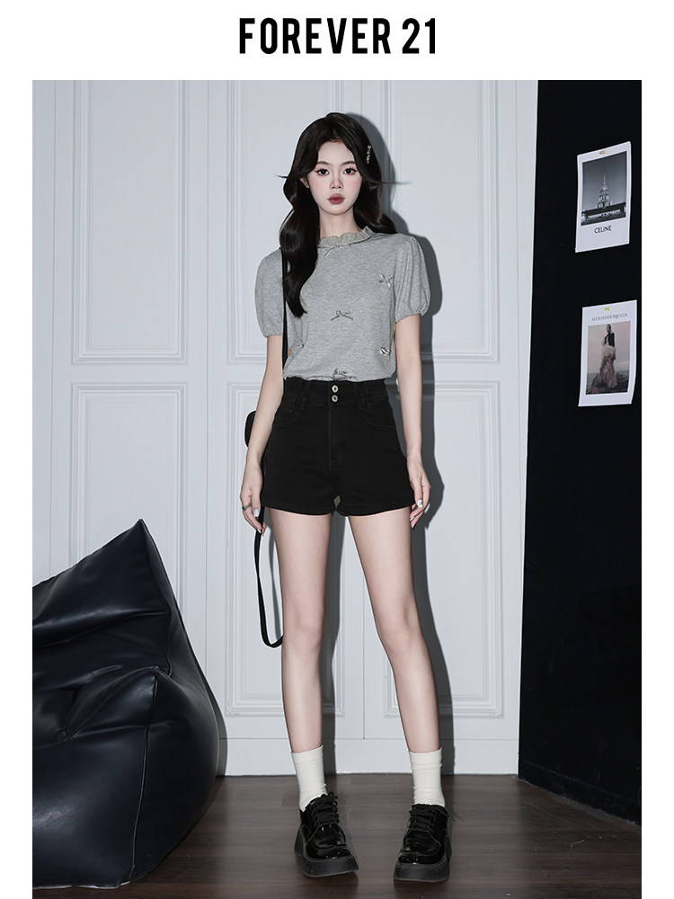 Forever21 American Style Hot Girl Black High-Waisted Denim Shorts for Women, Spring Design, A-Line Pear-Shaped Body-Hugging Hot Pants