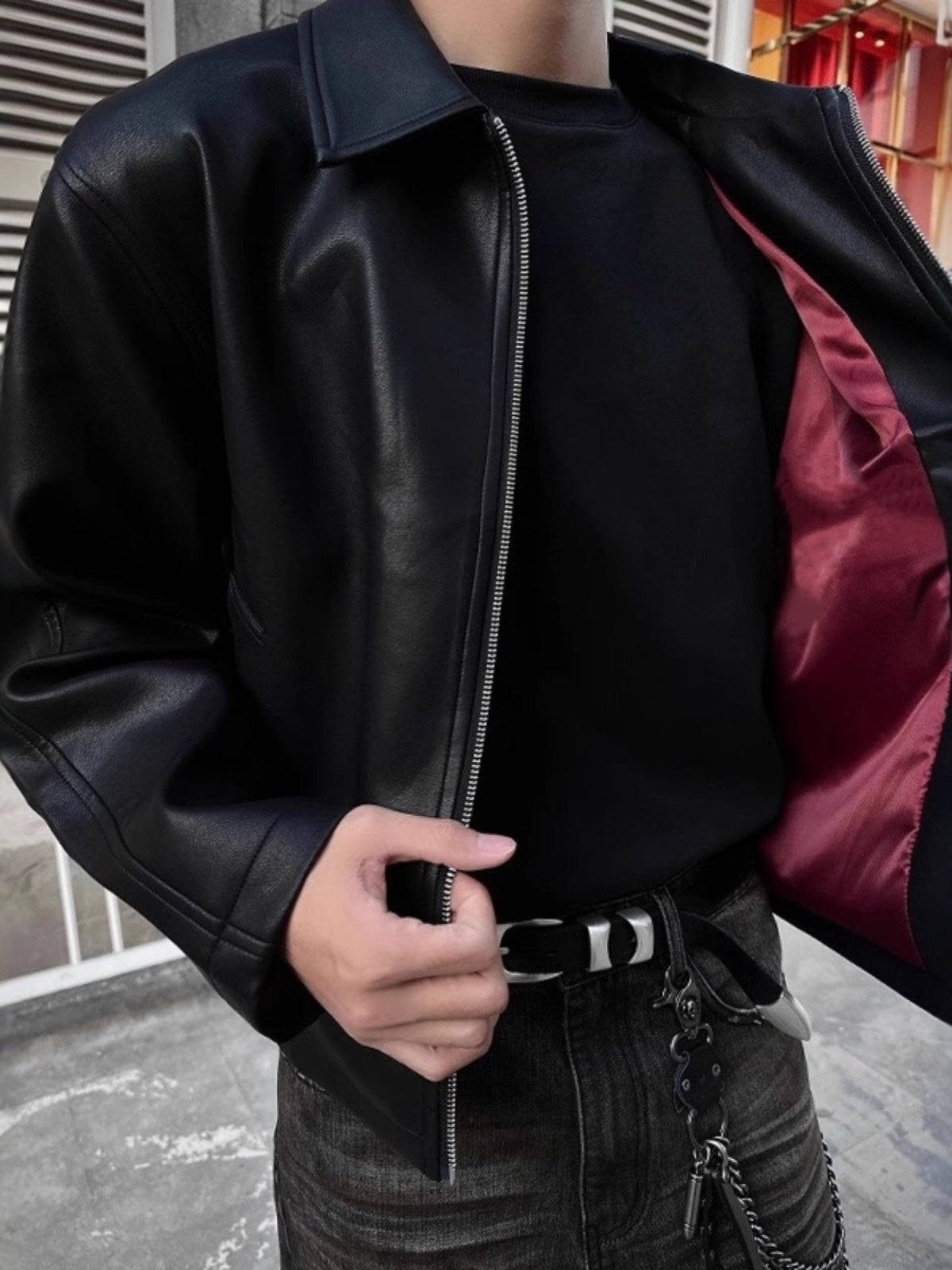 Spring New Textured Pu Leather Short Wide Black Leather Jacket for Men Cleanfit Jacket with Red Lining