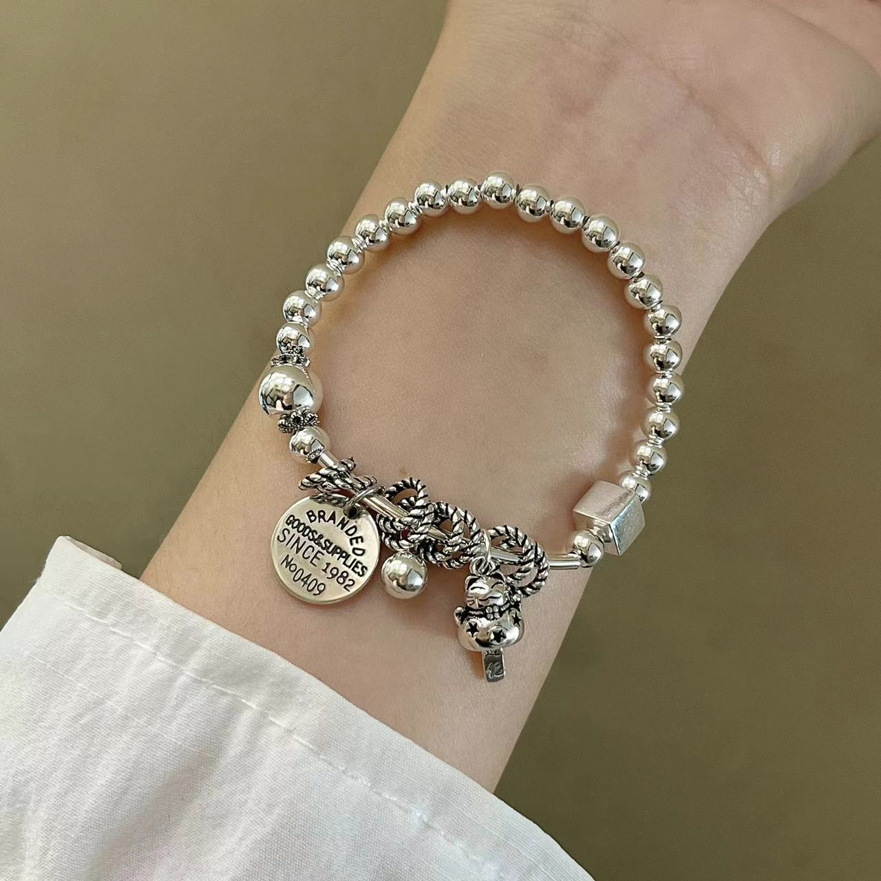 S925 Sterling Silver Vintage Lucky Cat Round Pendant Bracelet for Women, Round Bead Elastic Handmade Single Circle Bracelet, Versatile Birthday Gift