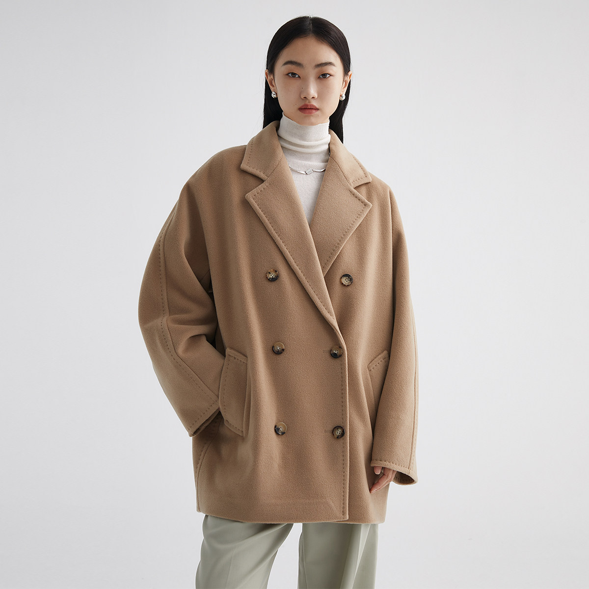 Classic Short 101801 Cashmere Coat for Women, Double-Breasted, Loose Fit, Petite, Guinea Casual Top Jacket