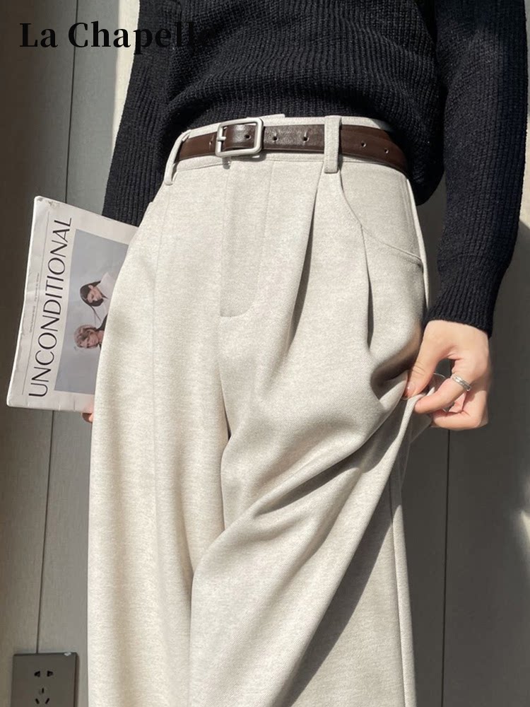 La Chapelle Fleece-Lined Woolen Pants, Wide-Leg Pants for Women, Spring, Autumn, and Winter, Petite Straight-Leg Narrow Version, High-Waisted Suit Trousers