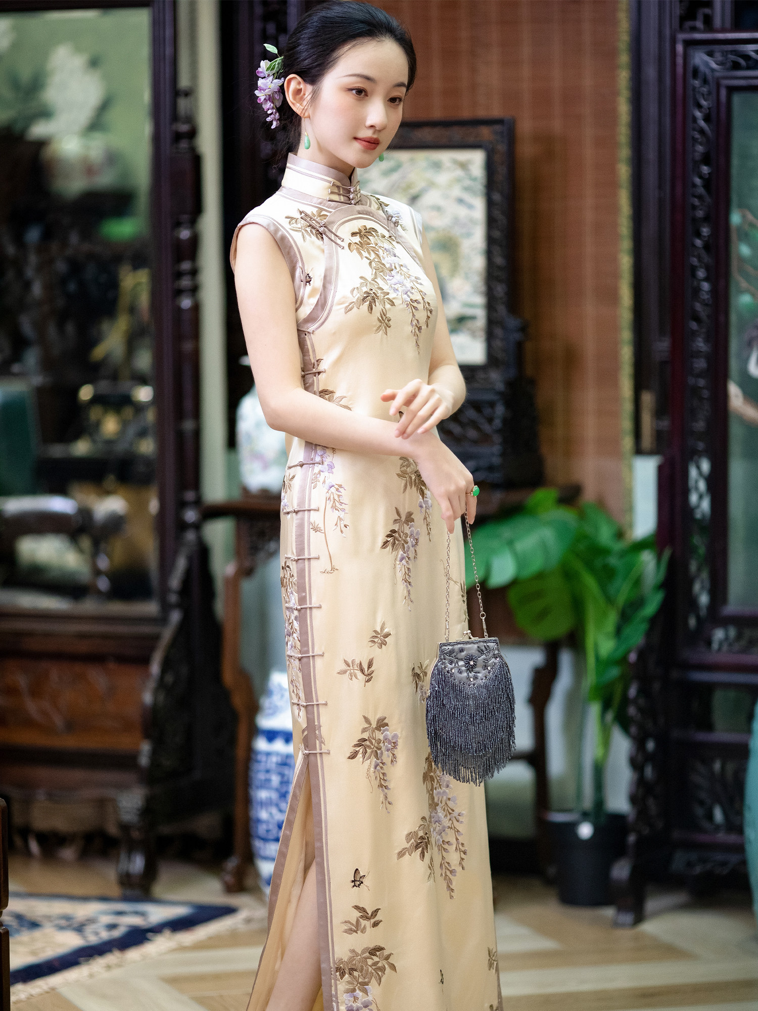 Purple Dream Cream | City Wind and Snow | Summer Silk Satin Heavy Embroidery Sleeveless Slim Fit Stand Collar Chinese Style Cheongsam