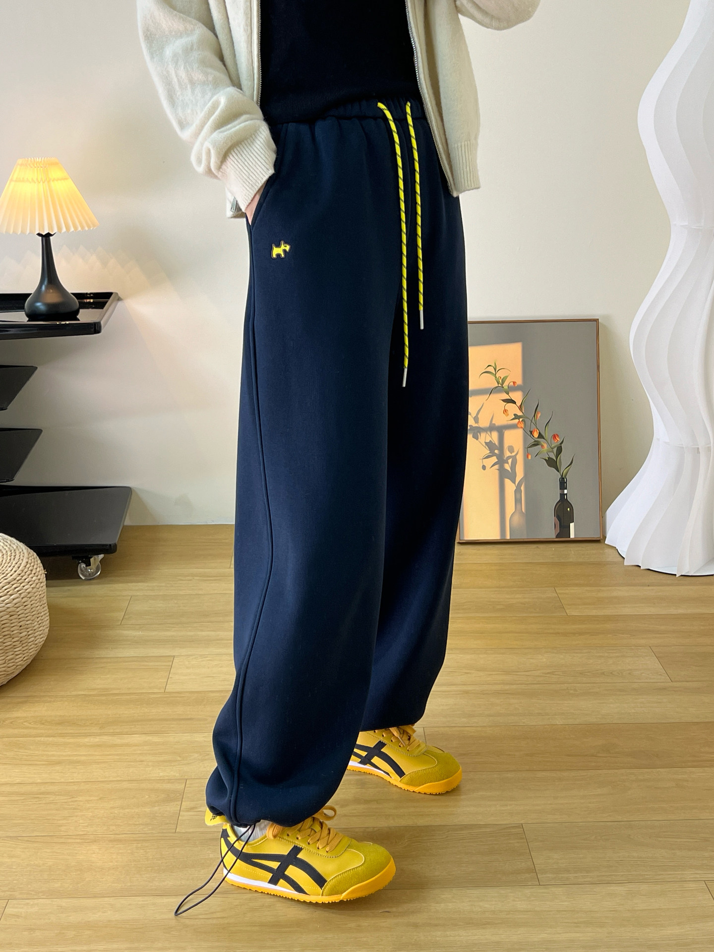 2026 Spring Color-Block Drawstring Sweatpants with Puppy Embroidery, Loose Fit, Jogger Style, Convertible Wide-Leg Straight Casual Pants for Women