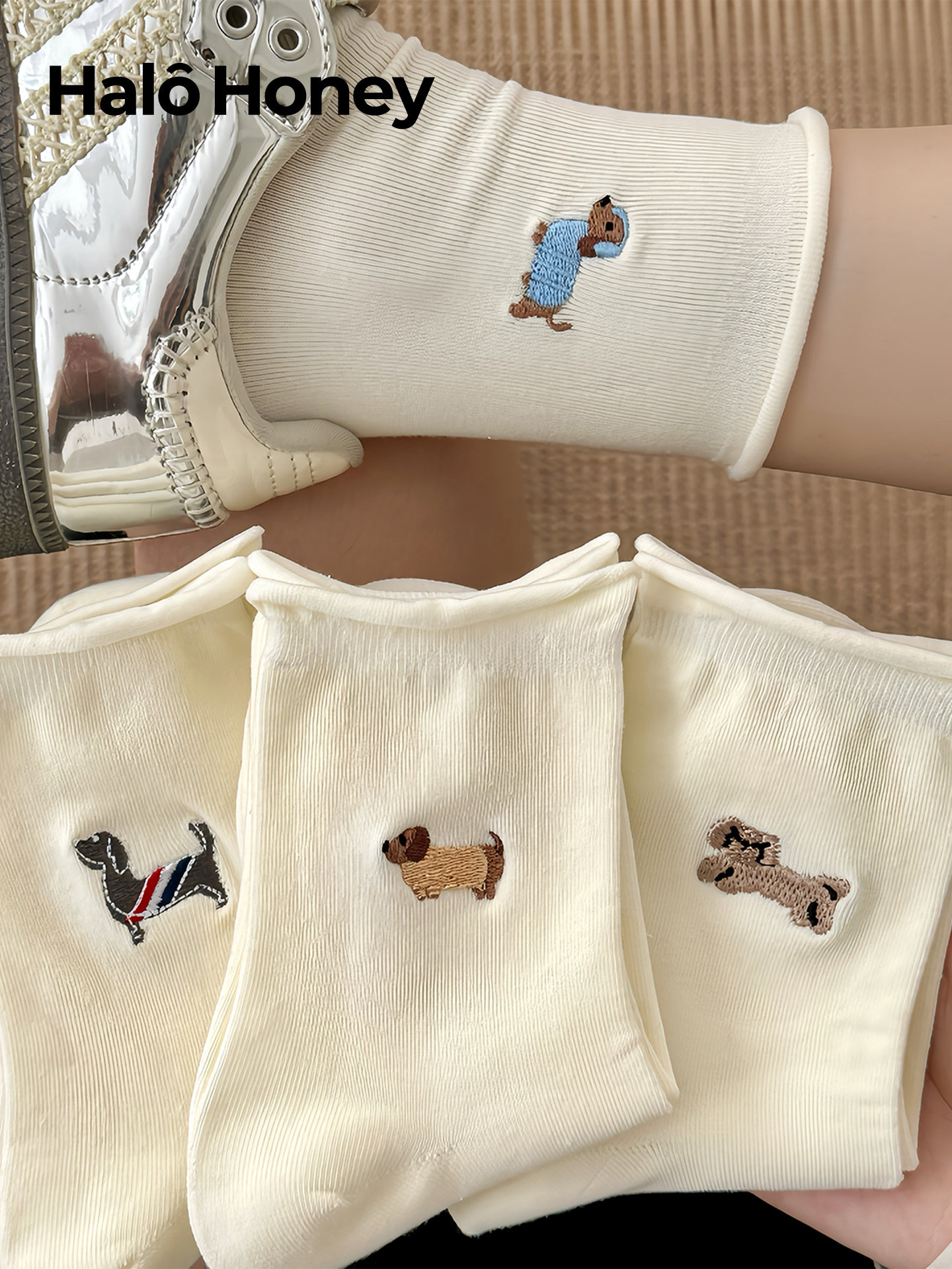 Cute Puppy Curled White Socks for Women, Mid-Calf Socks, Trendy Pure Cotton Spring and Autumn Japanese Style Cartoon Autumn and Winter Slouch Socks