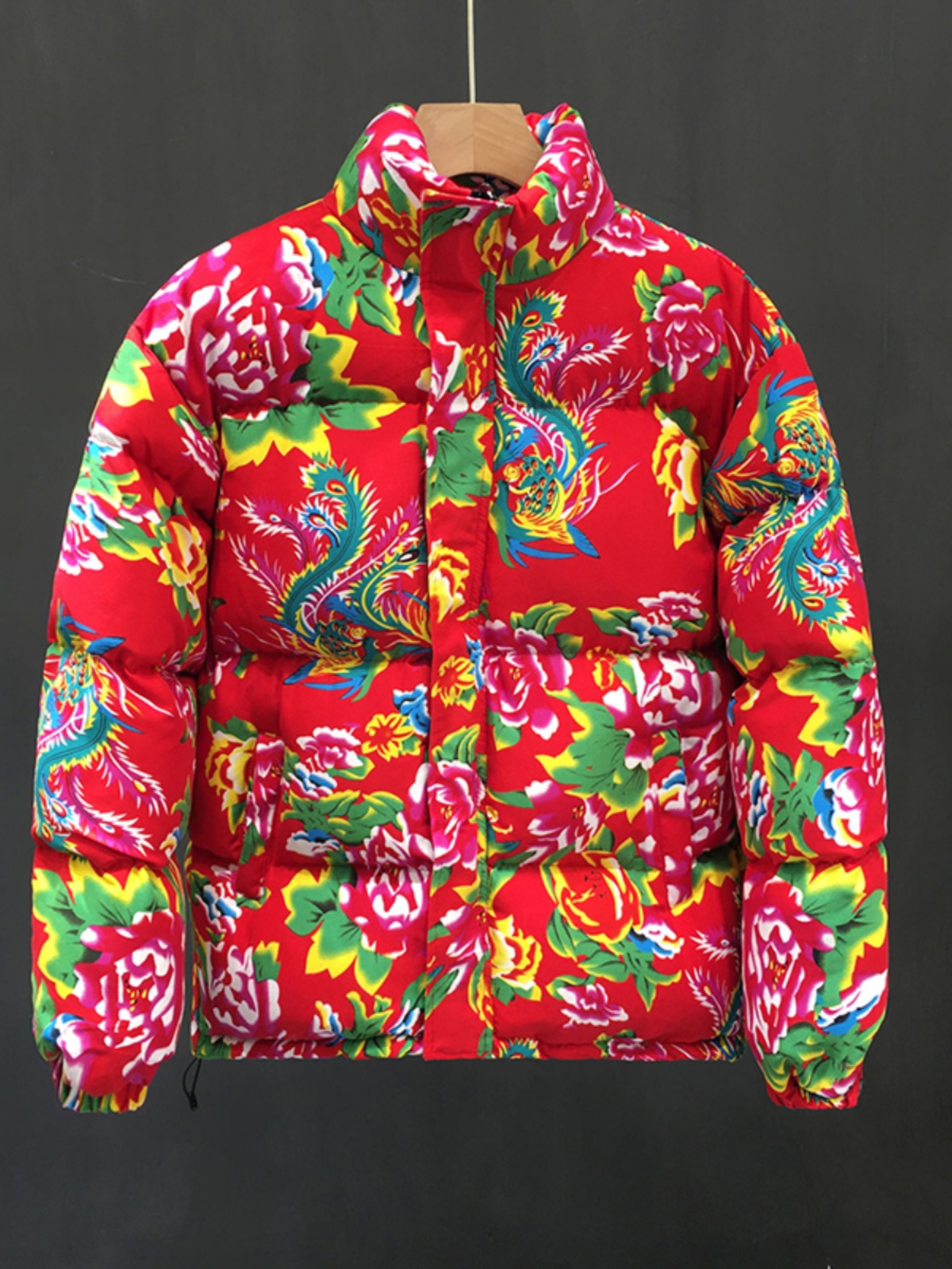 Northeastern Large-Patterned Cotton-Padded Jacket for Men, Winter Thickened Trendy Retro Red Cotton Coat, Warm and Festive for the New Year, Puffer Jacket
