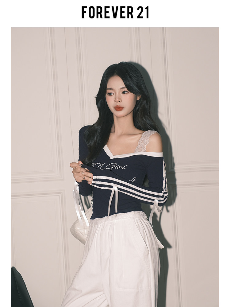 Forever21 American-Style Navy Blue Chic Lace Camisole Fake Two-Piece Sweet and Spicy Top Women's Slim-Fit Striped Long-Sleeve T-Shirt