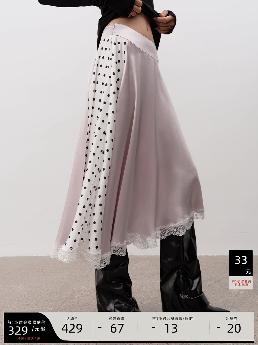 Jcaesar Women Polka Dot Patchwork Lace Long Dress, Satin Fabric, Side Double Zipper, Adjustable Waistband