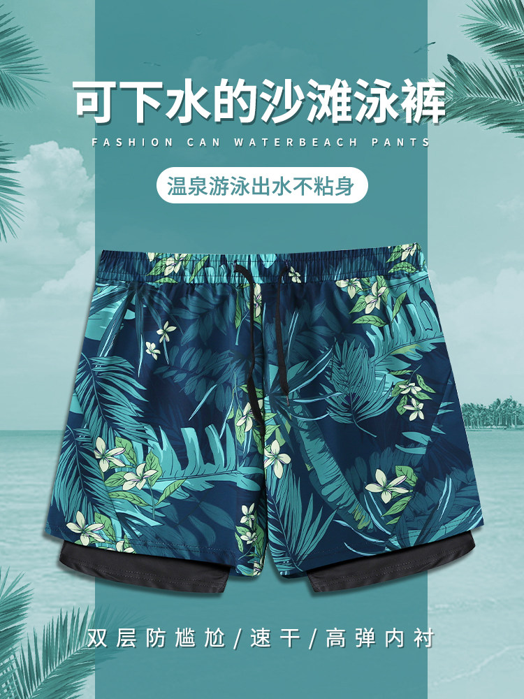 Double-Layer Anti-Embarrassment Beach Shorts Men's Swimwear Quick-Drying Couple's Lined Five-Point Shorts Seaside Hot Spring Large Size Swim Trunks