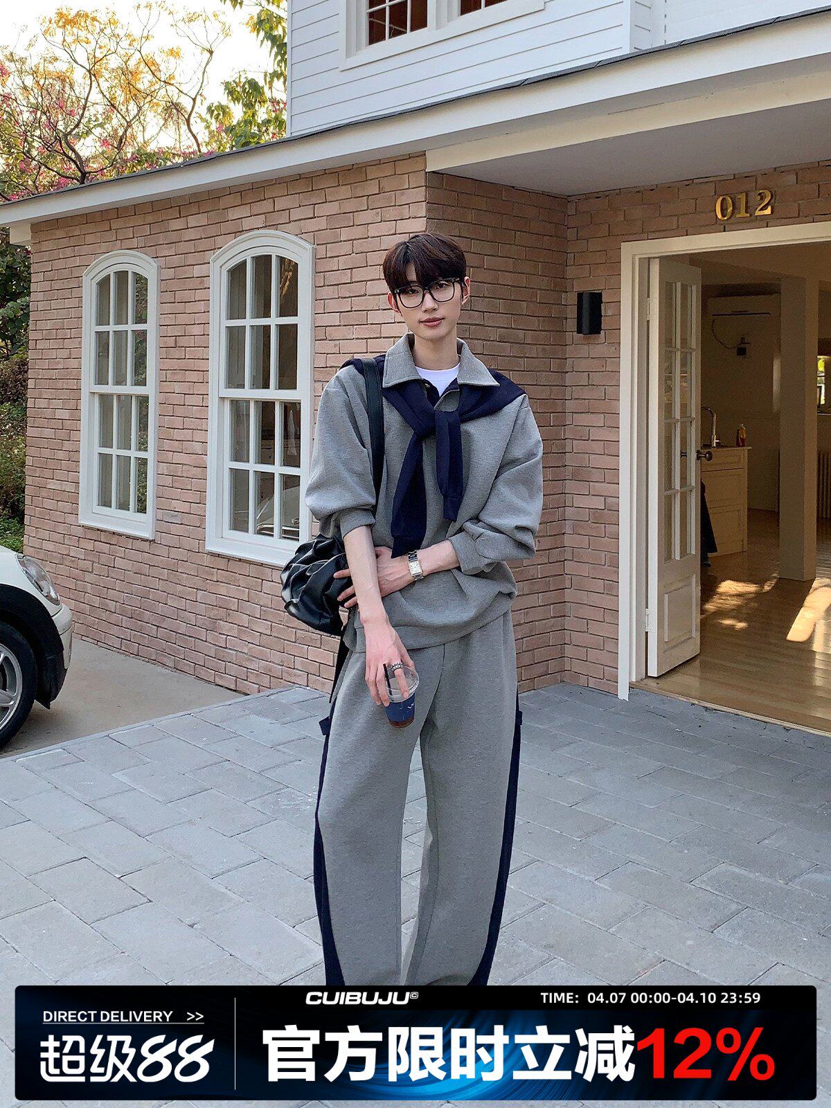 Cuibuju Korean Style Old Money Style Shawl Color-Blocked Lapel Sweatshirt Set Loose Fashion Straight-Leg Casual Pants for Men