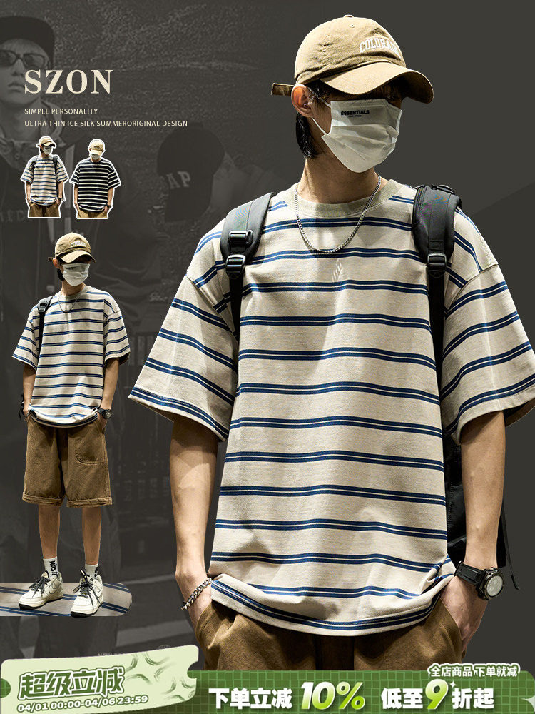 Striped T-Shirt for Men 2026 New American Style Trendy Brand Pure Cotton Round Neck Half-Sleeve Loose Casual Hong Kong Style Short Sleeve ins Summer