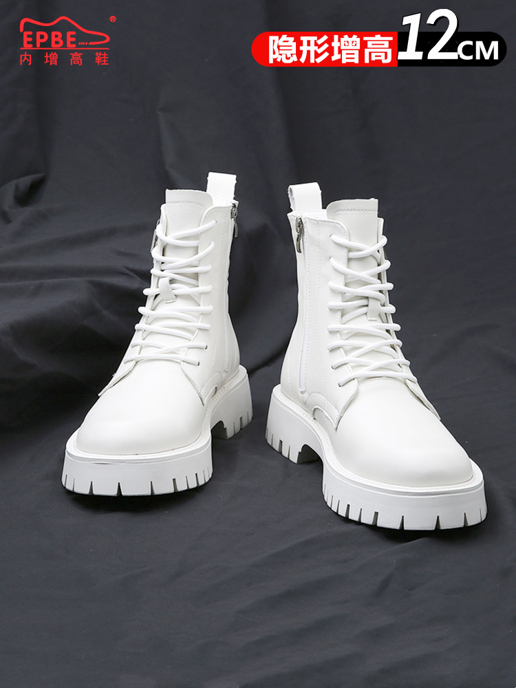 High-End Martin Boots for Men, High-Top British Style Soft Leather White Work Boots, Spring Thick-Soled Genuine Leather Height-Increasing Men's Shoes 12cm