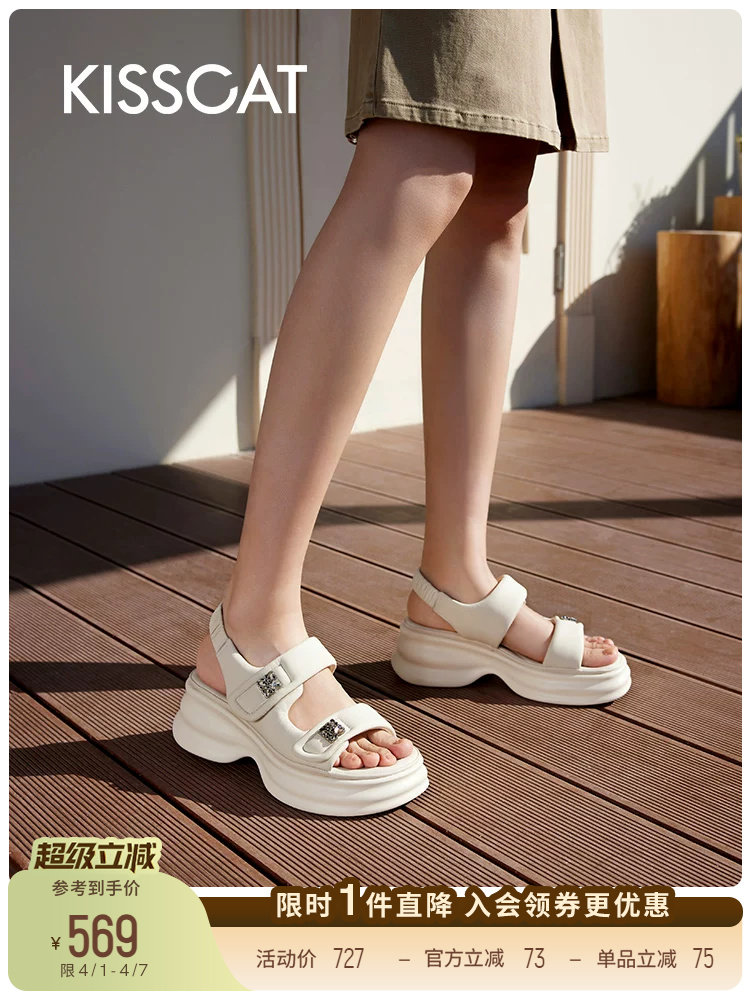 Kisscat [5.5cm Coin-Length Long-Leg Sports Sandals] Thick-Soled Height-Increasing Velcro Sports Sandals for Women
