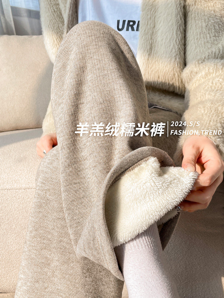 Oatmeal-Colored Lamb Wool Glutinous Rice Pants for Women, Spring and Autumn, Fleece-Lined, High-Waisted, Drapey, Straight-Leg, Casual, 2026 New Wide-Leg Pants