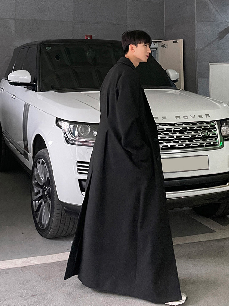 Bishe Autumn and Winter New Men's Solid Color Korean Style Woolen Coat, Extra-Long Over-The-Knee Jacket, Cool and Casual Black Trench Coat